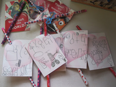 Gordon's valentines for school. I think it is hilarious how Gordon can't possibly just write people's names. He has to embellish every letter.